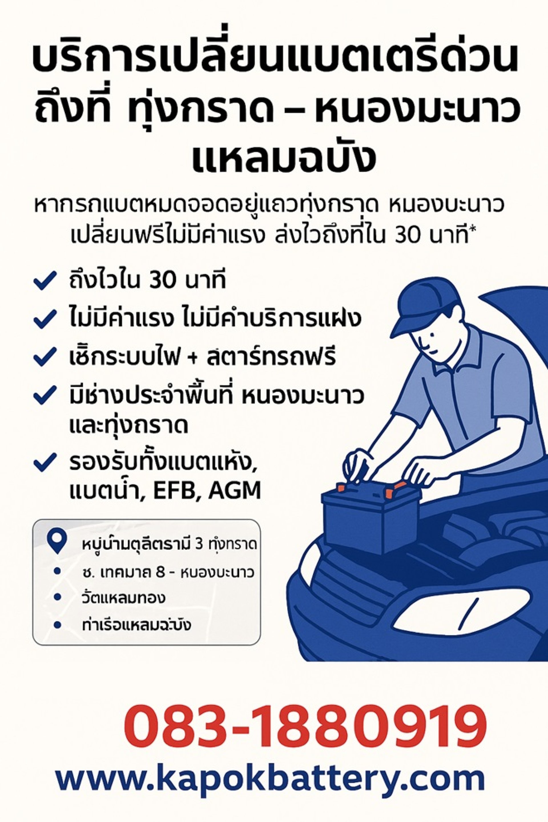 เปลี่ยนแบตเตอรี่รถยนต์ถึงบ้าน ทุ่งกราด–หนองมะนาว บริการฟรี